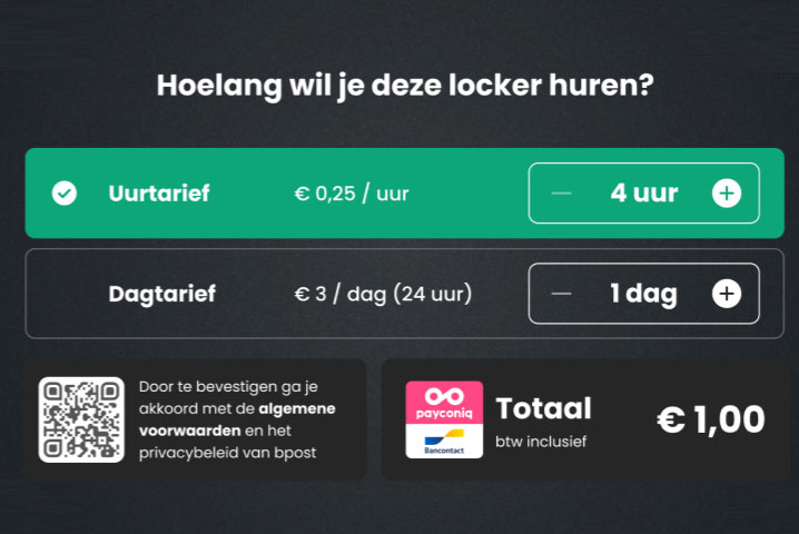 De tarieven zijn afhankelijk van de huurtermijn en de grootte van de locker. Betalen doe je makkelijk bij ophaling via Payconiq by Bancontact. Dit kan je via de meeste Belgische bankapps. Neem dus zeker je smartphone mee als je je spullen ophaalt.