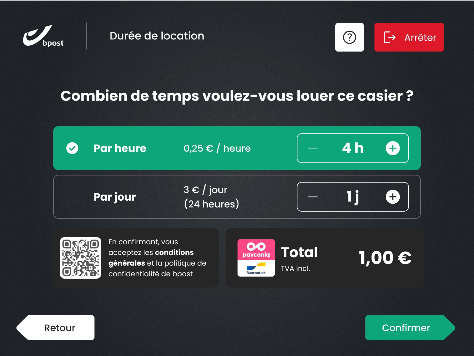 Les prix dépendent de la taille du casier et de la durée de location. Le paiement s’effectue au moment du retrait, via Payconiq by Bancontact, disponible dans la plupart des apps bancaires.